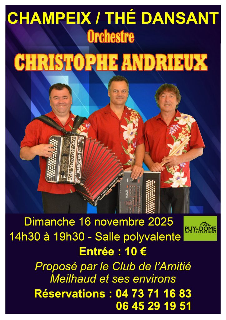 Le Club de l’Amitié de Meilhaud et ses environs vous invite à un après-midi festif et convivial animé par l’orchestre Christophe Andrieux ! Accordéons, claviers et ambiance chaleureuse seront au rendez-vous pour danser, se retrouver et passer un bon moment.