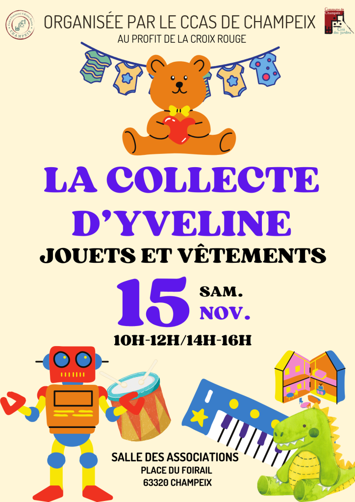 La collecte de jouets, livres et vĂŞtements, organisĂ©e par le CCAS, revient cette annĂ©e ! Au profit de la Croix-Rouge et de la Ressourcerie du Pays d’Issoire, elle aura lieu :