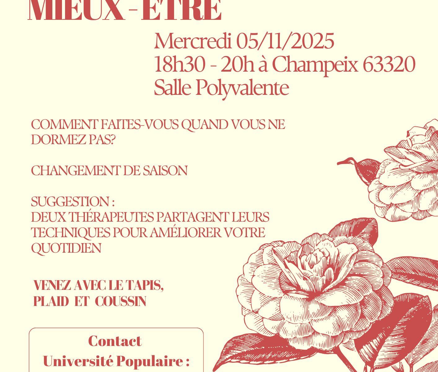 Et si vous preniez un moment pour vous ? L’Université Populaire Champeix Les Couzes vous invite à un atelier d’échanges convivial autour du mieux-être, du sommeil et du changement de saison.