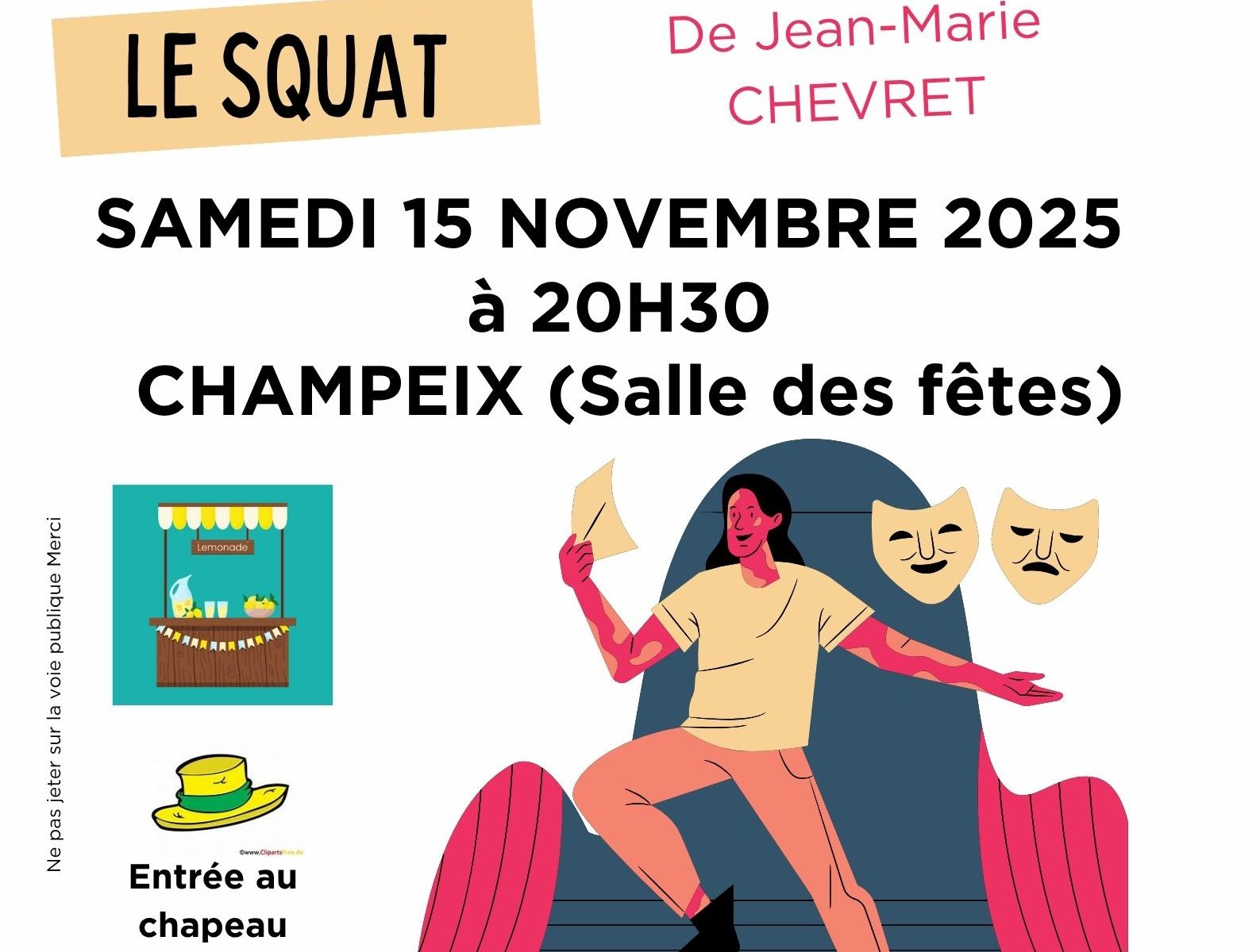 L’association D’Ages en Ages et sa troupe Les Tribaladins vous invitent à une soirée pleine d’humour, d’émotion et de réflexion autour de la pièce « Le Squat », écrite par Jean-Marie Chevret, organisé par l’Association Champeix Animation.