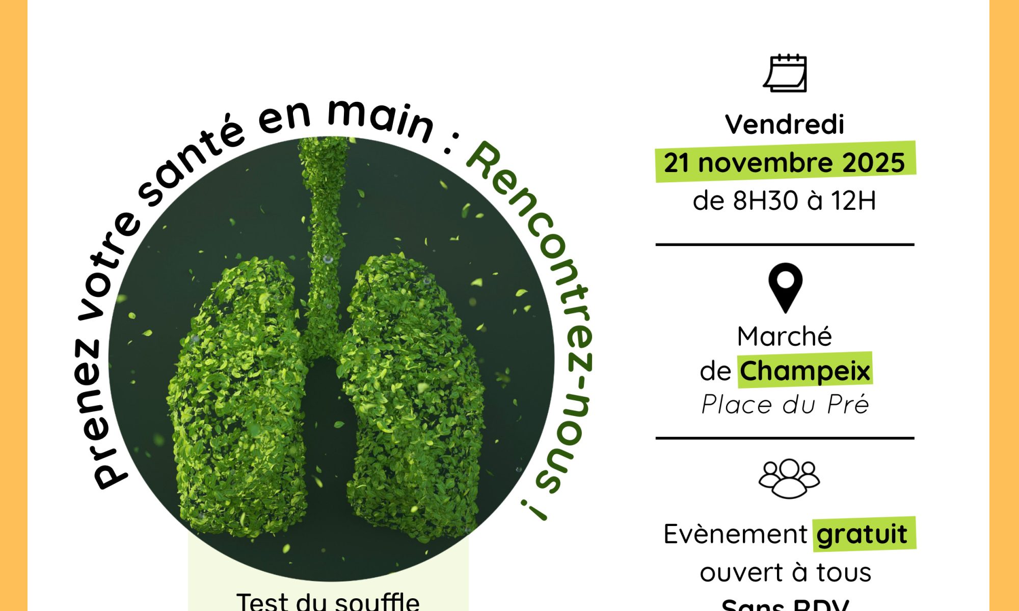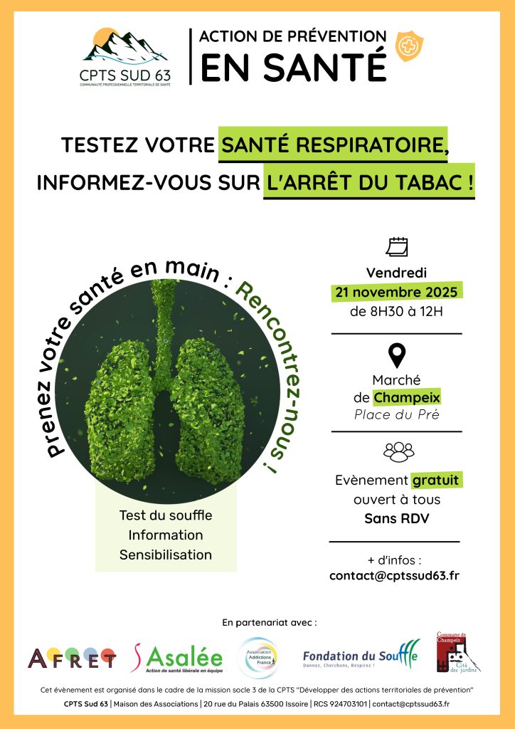 Vendredi 21 novembre 2025, la CPTS Sud 63 vous donne rendez-vous au marché de Champeix (Place du Pré) pour une matinée dédiée à votre santé respiratoire.